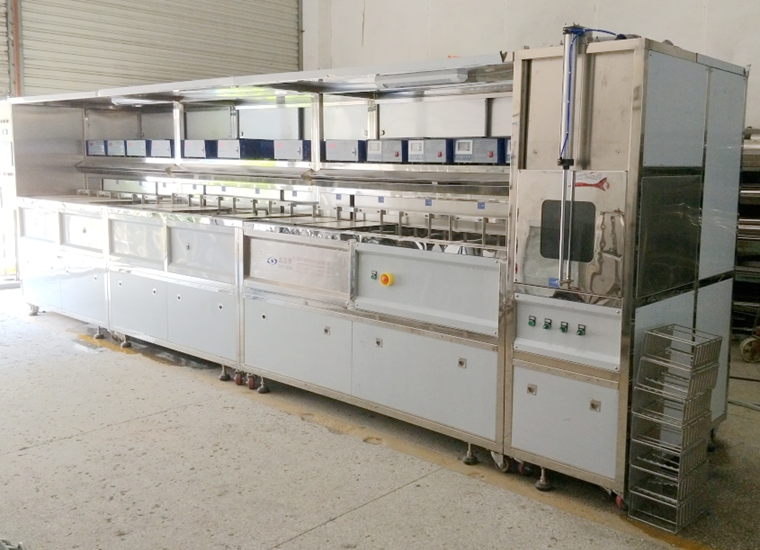 威固特微納超聲波清洗機此臺超聲波清洗機的槽體每槽設四面溢流口,溢水槽寬35 mm,各槽皆為獨立循環槽,由循環泵將洗劑由儲液箱抽出經過濾后再運回清洗槽,即子母槽循環。